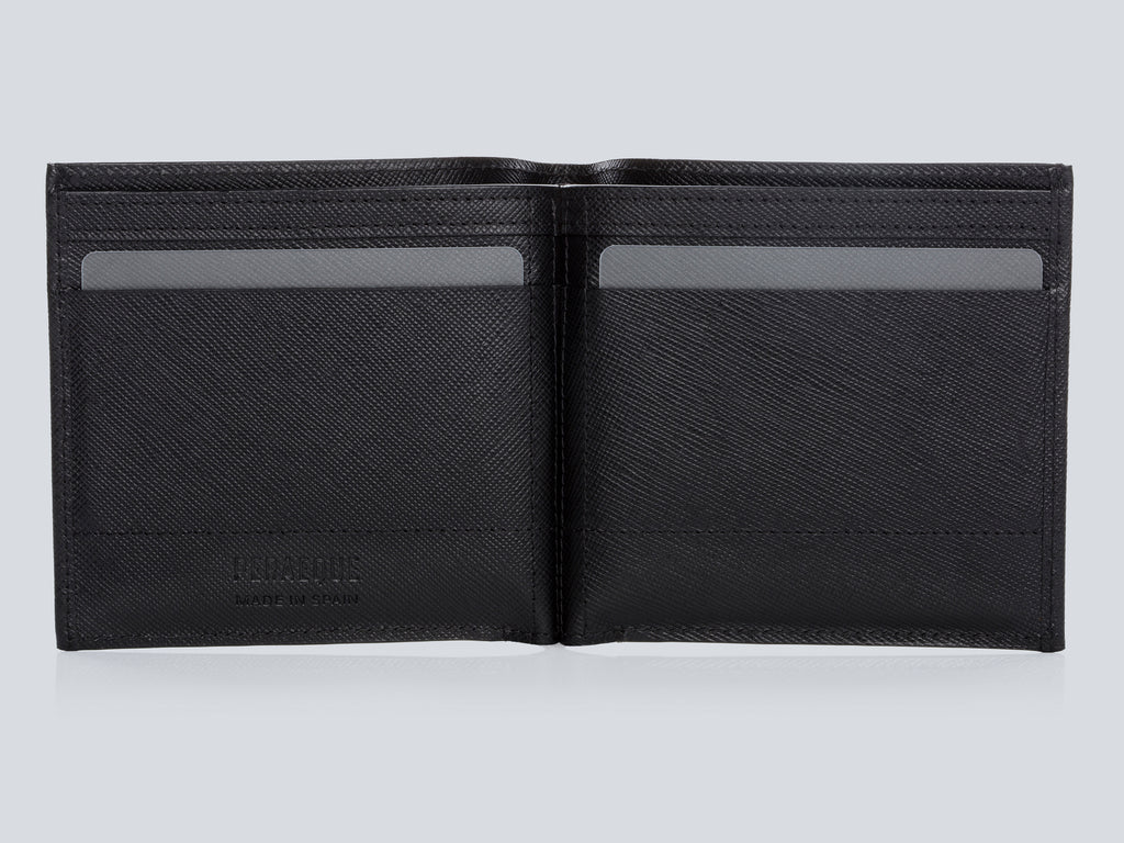 A NEW MEN'S BI-FOLD WALLET DESIGN WITH UNIQUE FOLDING ACTION. INCORPORATES TWO POCKETS THAT EXPAND TO ACCEPT MULTIPLE CARDS WHEN THE WALLET IS OPENED AND CONTRACT TO SECURE CONTENTS WHEN CLOSED. THIS UNIQUE DESIGN OPTIMISES THE USE OF SPACE, ENABLING THE WALLET TO REMAIN EXCEPTIONALLY SLENDER CONTAINING MULTIPLE CARDS AND BILLS.